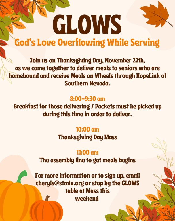 If you are unable to leave your home, please contact Patti Sabo at 702-269-3110 to arrange for an Extraordinary Minister of Holy Communion to visit you. If you are hospitalized, please notify the hospital staff of your Catholic faith and desire to receive Communion.