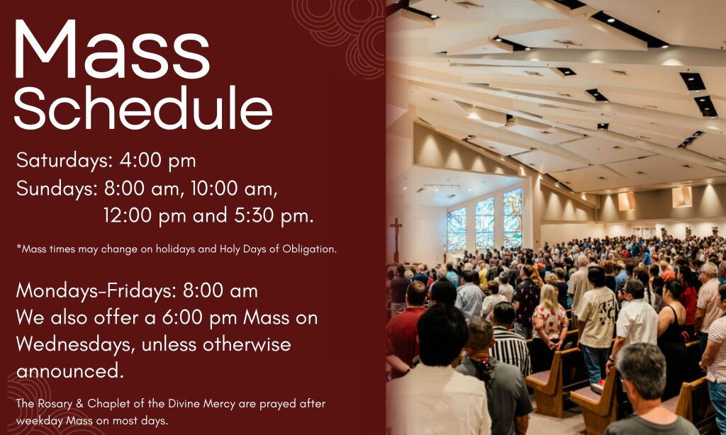 Mass Times While Traveling: Parishioners who are traveling may go to www.masstimes.org for the location and schedule of masses in Catholic Churches throughout the USA.